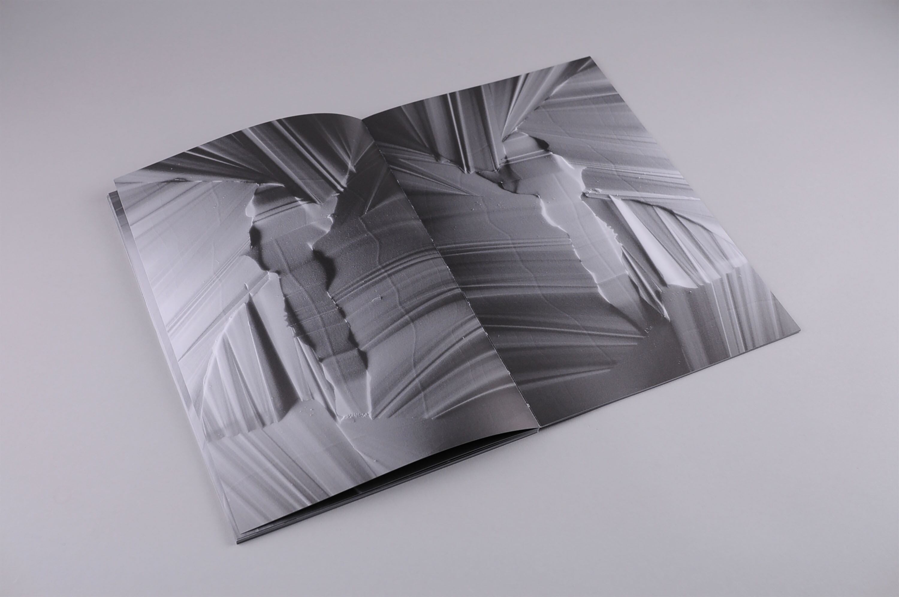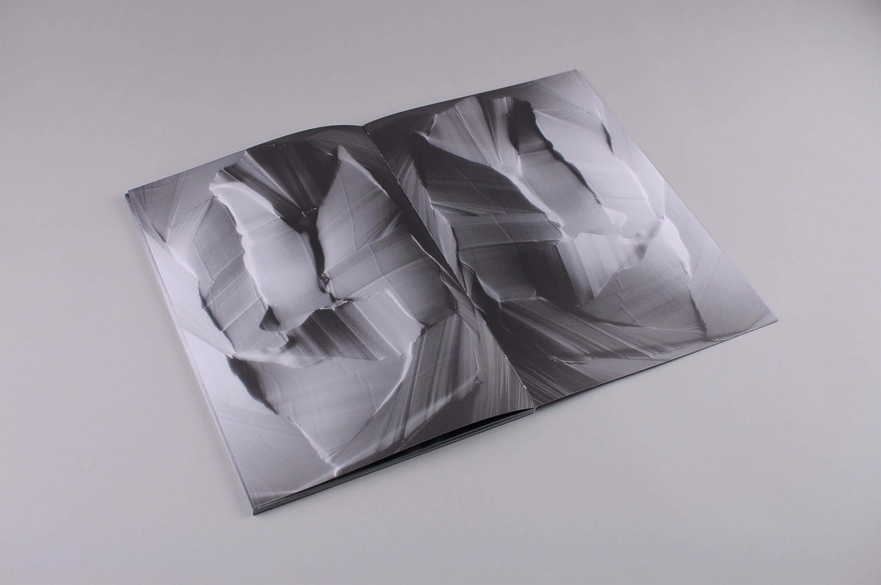 複製とその媒体について考え試みた2005年の作品を元にして、新たに制作してまとめた写真集。148×100×11mmのハガキサイズの消しゴムを、側面からカッターの刃を入れて二つに割り、それぞれに光をあてて撮影する。少しだけ力みを必要とし、コントロールしにくい刃が通過していった跡は、即興性を持った像として消しゴムに刻まれると同時に、その鏡像としてもう一つの像を生み出す。切り分けられた2枚1組の像を眼球の往復によって、あるいは本を閉じることでもう一度重ね合わせること。